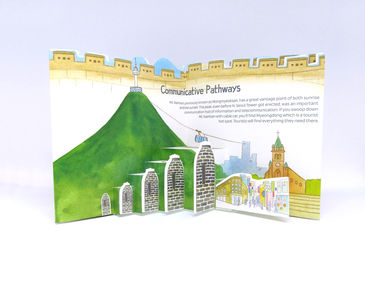 This book opens like a folding screen. Inside there, the Seoul City Wall and its each trails pops up. Short explanations are written on side of each pages describing key factors and side notes. Map given on the back.